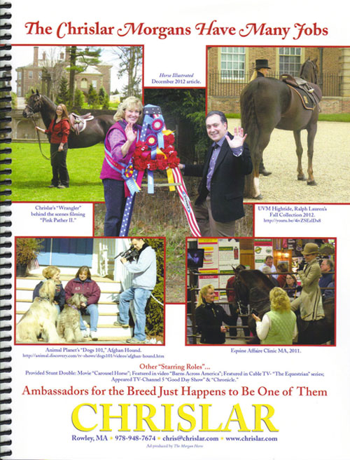 Chrislar Morgan horses have many jobs besides making their riders happy in riding lessons, trail riding and showing. Chrislar’s Morgans are not only talented, they are well trained and sensible. Watch the video and photos of Chrislar's Morgan horses as models in a Ralph Lauren advertisement. They have appeared on TV and at numerous events.